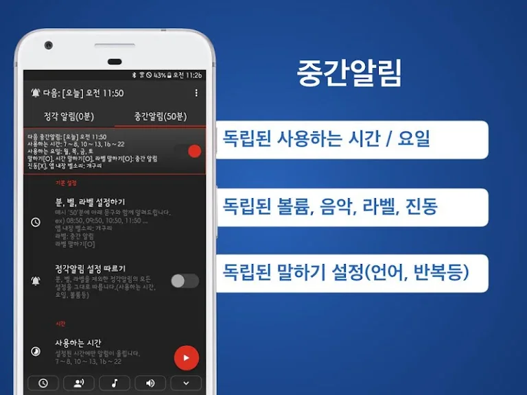 ■ 정각알림과 중간알림의 완벽한 독립 설정
