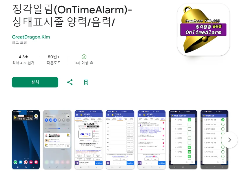 이 어플은 구글플레이스토어에서 "정각 알림"로 검색했을때 1번째로 나오는 어플입니다. 아래는 정각알림(OnTimeAlarm)-상태표시줄 양력/음력/ 어플에 대한 자세한 설명이니 참고하세요.