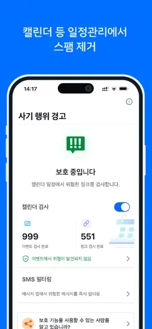 이 앱은 메시지 속 피싱 시도나 악성 캘린더 이벤트를 즉시 감지해서 차단해줍니다. 개인 정보나 금융 정보를 보호하는 데도 도움을 주니, 혹시 모를 사기나 해킹으로부터 걱정을 덜 수 있어요. 일상 속에서 은근히 노출될 수 있는 위험들을 미리 막아주는 셈이죠.