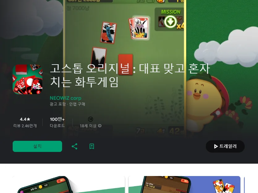 아래는 고스톱 오리지널 : 대표 맞고 혼자 치는 화투게임 어플에 대한 스크린샷 정보입니다.