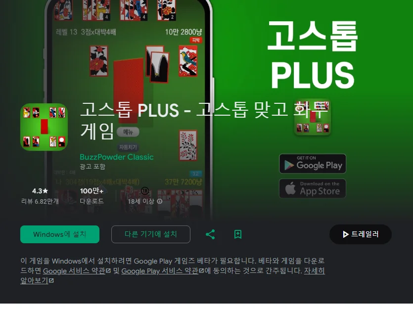이 어플은 구글플레이스토어에서 "고스톱 게임"로 검색했을때 1번째로 나오는 어플입니다. 아래는 고스톱 PLUS - 고스톱 맞고 화투 게임 어플에 대한 자세한 설명이니 참고하세요.