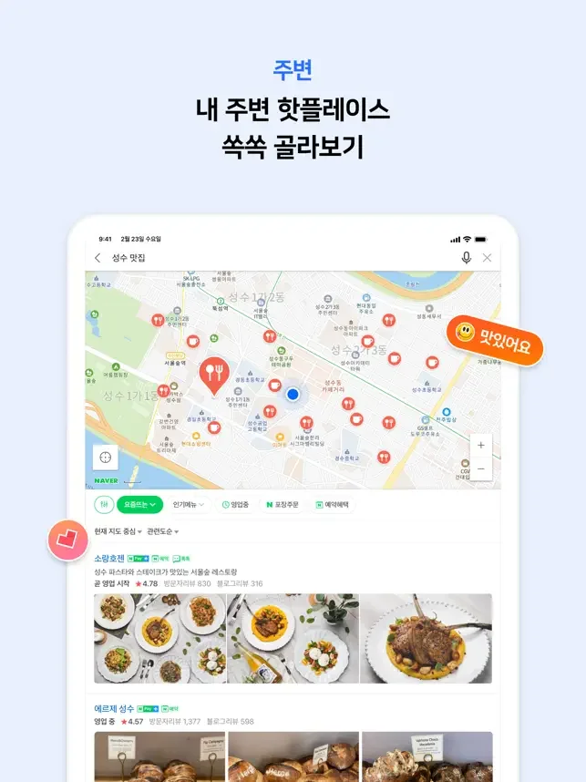 네이버 사용자 데이터를 기반으로 제공하는 내 주변의 맛집, 가볼만한 곳 정보를 확인 할 수 있어요.