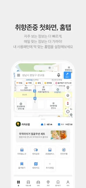 홈에서 바로 주변 정보와 저장, 대중교통, 내비게이션, MY탭을 편리하게 사용할 수 있어요.