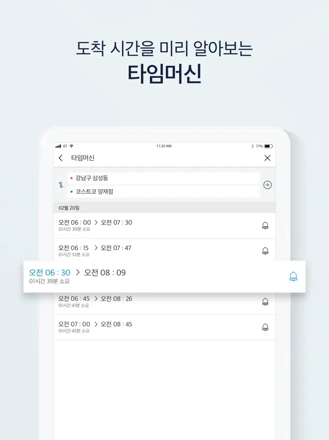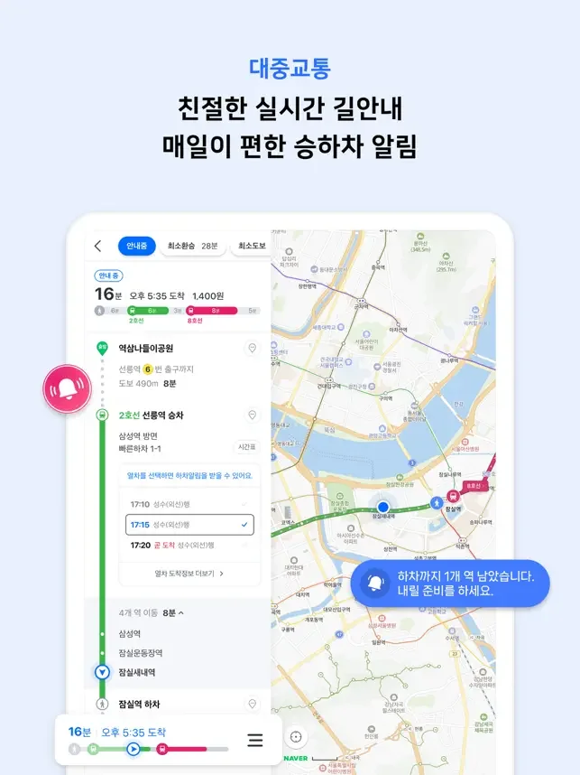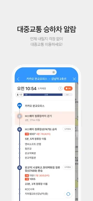 다양한 대중교통 길찾기 결과를 확인하고, 실시간 도착정보와 승하차 안내 기능으로 쉽고 편리하게 목적지까지 갈 수 있어요.